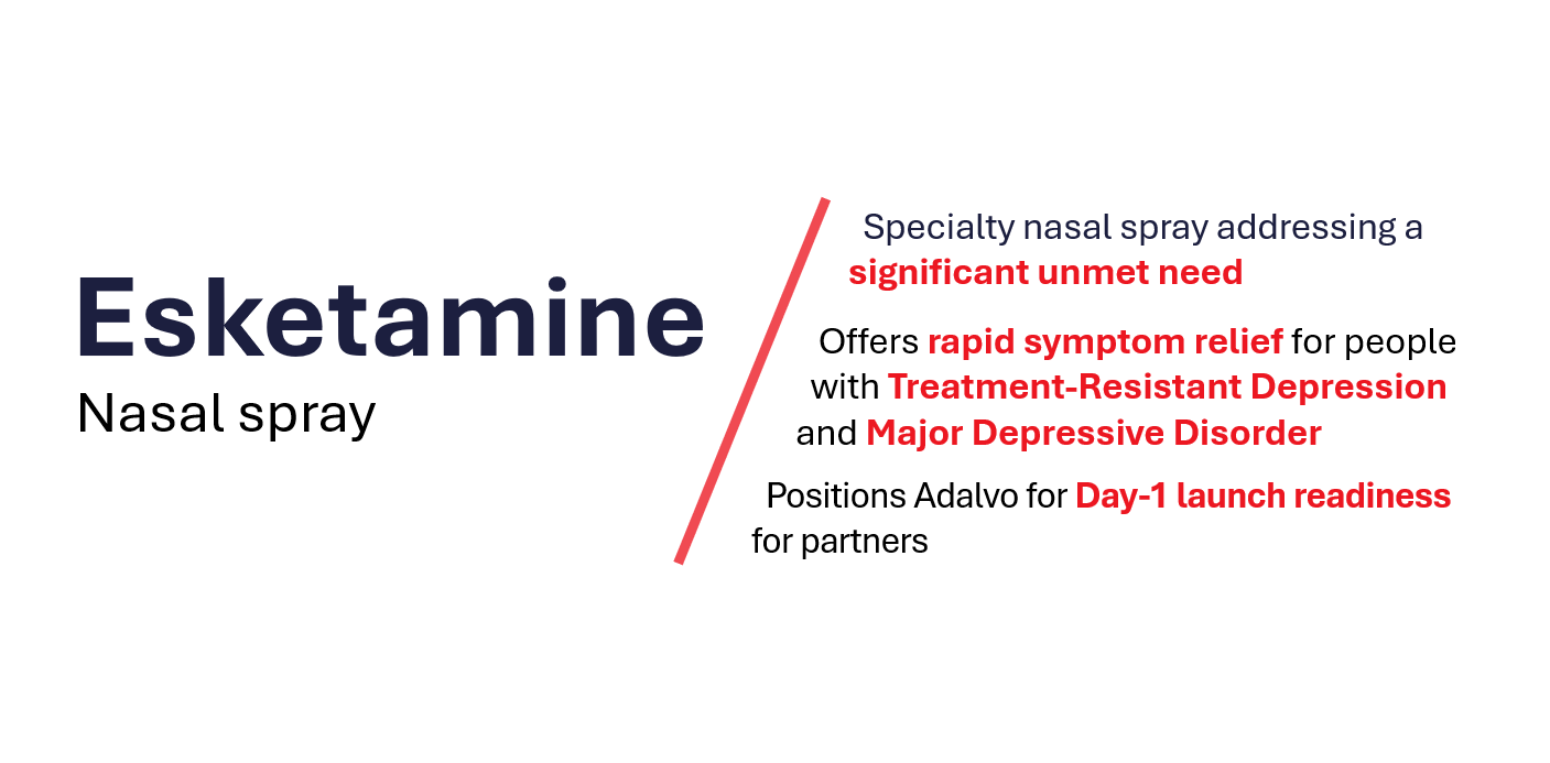 Based on the reference brand Spravato, Esketamine nasal spray has been approved in several regulated markets for adults with Treatment-Resistant Depression (TRD) in combination with an oral antidepressant.